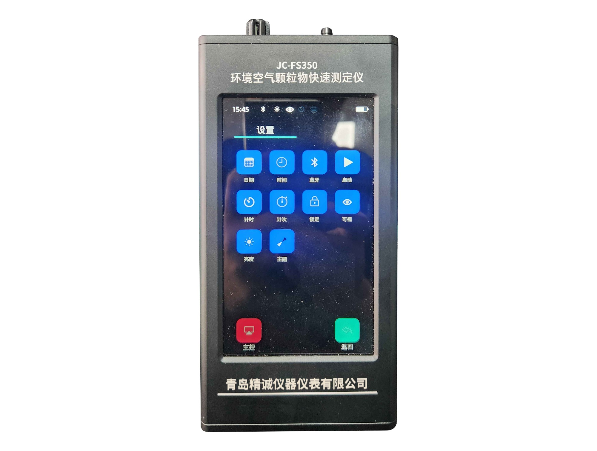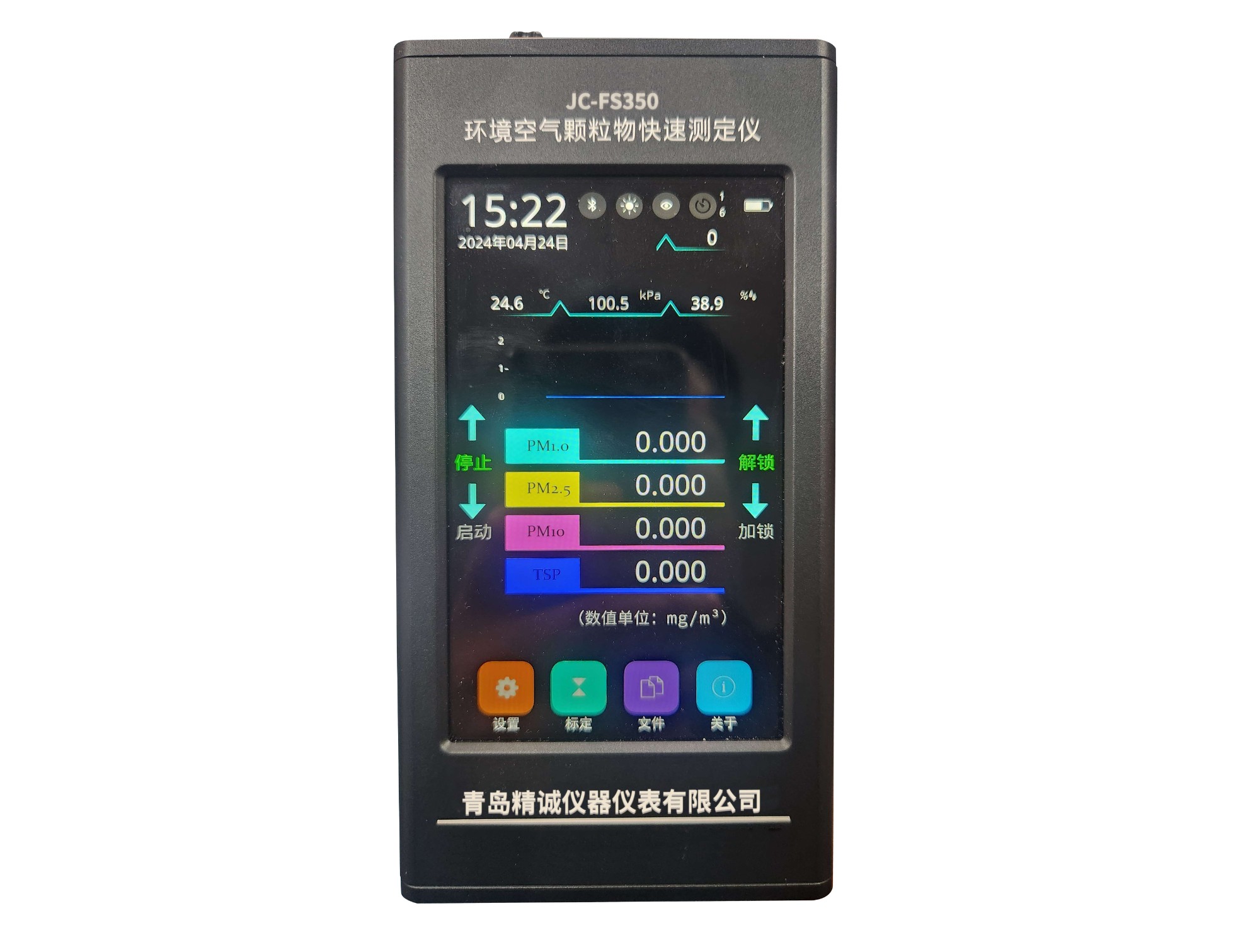 2、高清5.6寸彩色触摸显示屏,强光下可清晰显示测量数据(时间、粉尘浓度、环境温度、湿度、大气压、亮度、电量、充电状态、打印、蓝牙状态、存储、4种颜色曲线图),可触屏滑动解锁及触屏滑动开启测量;